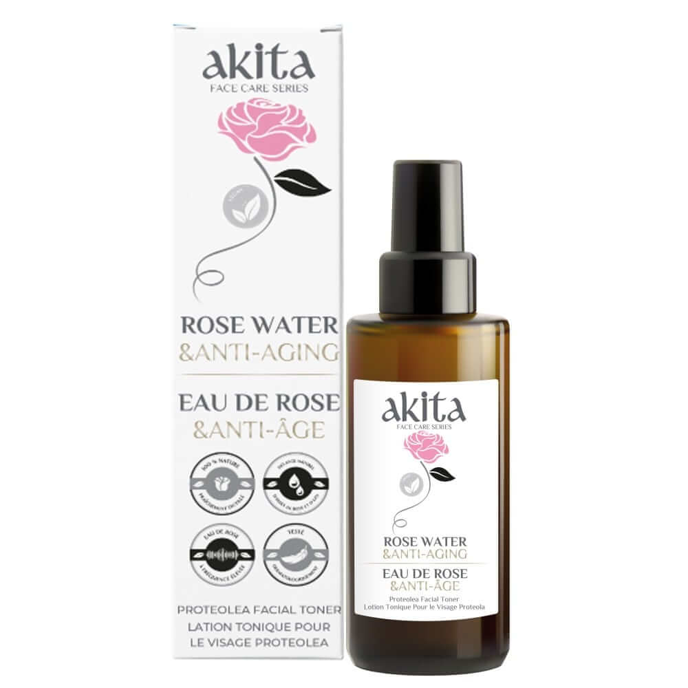 The Akita Anti-Aging Rose Water is a premium skincare product that stands out due to its unique production method and natural composition. This facial tonic is crafted using fresh, organic Rosa Damascena flowers, renowned for their valuable and beneficial essential oils. In a distinctive process, these flowers are boiled in copper alembics. The steam, carrying the essential components of the rose flower, is then condensed to produce a high-quality rose water that retains the full potency of the original plant. Unlike conventional rose water, which is often a byproduct of distilling rose essential oil, Akita's method ensures the preservation of the precious rose essential oil within the water. This results in a product rich in vitamins, minerals, essential fatty acids, and Proteolea extract, providing a comprehensive skincare solution.